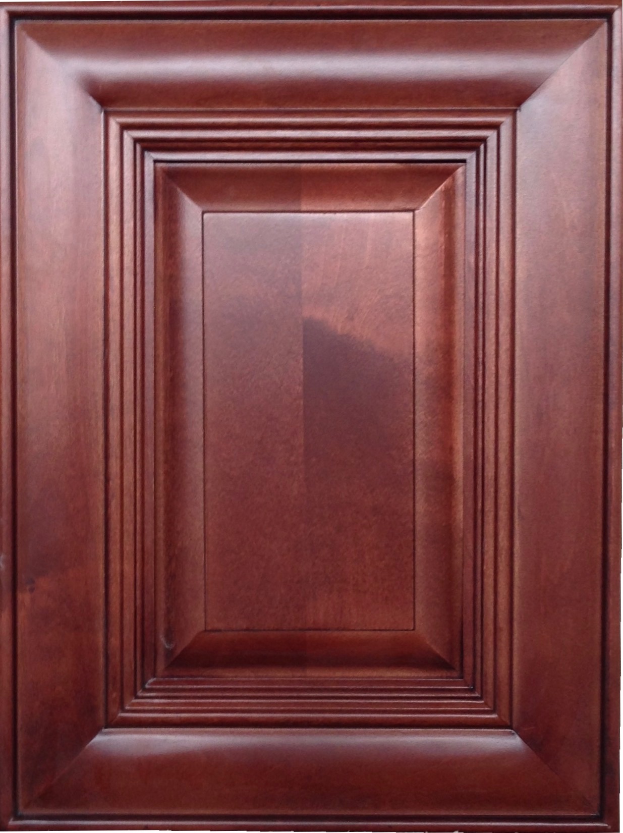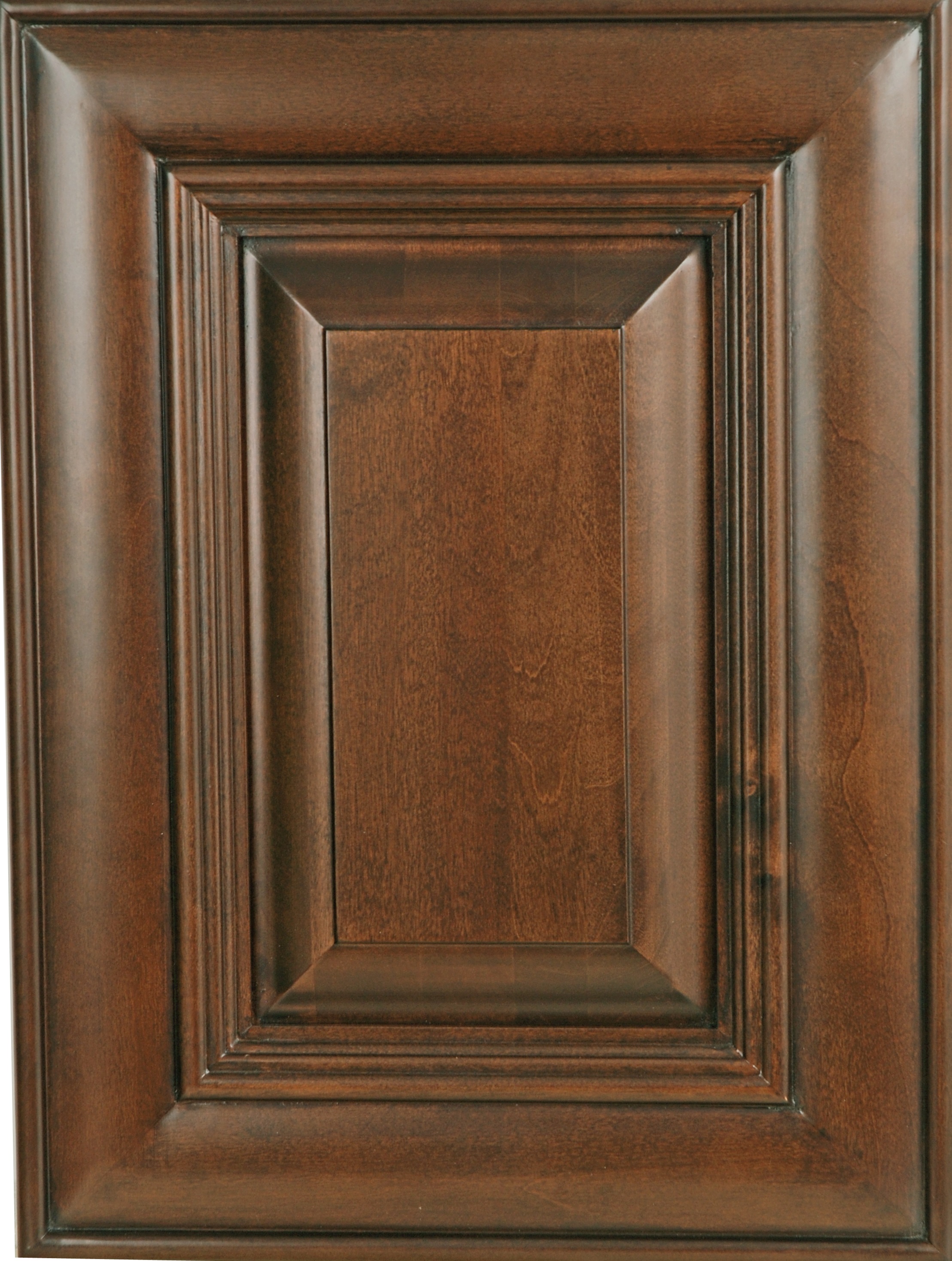 The Hampton door style is a raised panel mitered door with stair-step applied molding, a pillow profile and a decorative concave center panel.